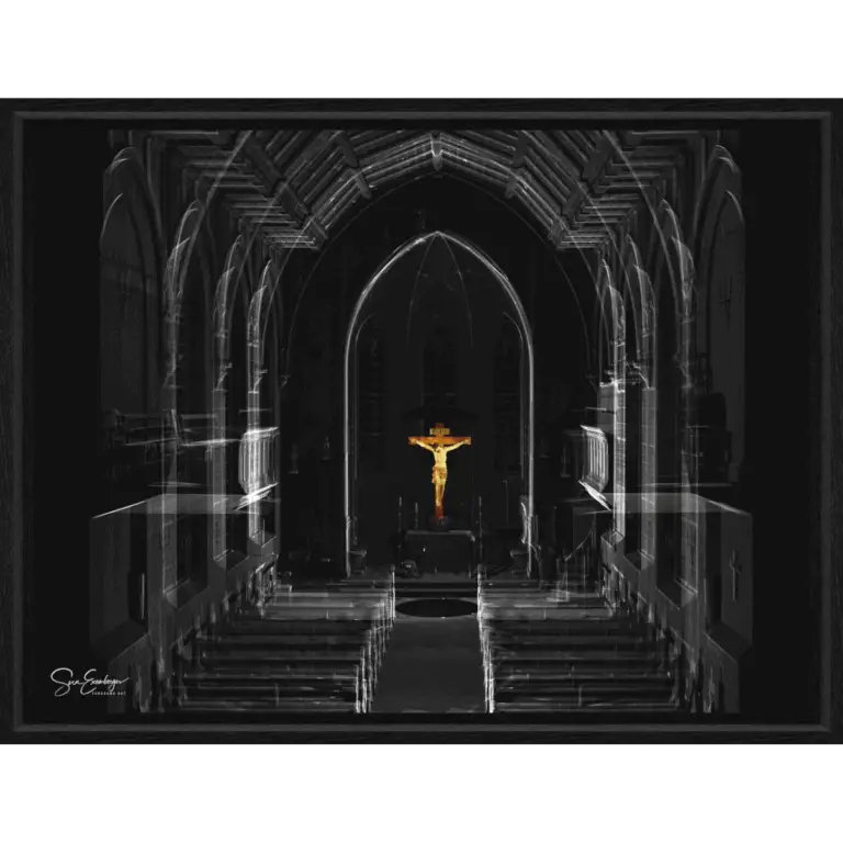 Das PanoramaArt Kunstwerk besteht aus 176 Millionen Bildpunkten im dreidimensionalen Raum, kunstvoll arrangiert in halbtransparenter Ansicht. Das Kreuz am Altar, im Zentrum der perspektivischen Ansicht, in seinen Originalfarben hervorgehoben.